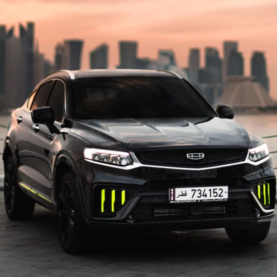 * A deposit of 1 500 AED will be blocked from the renter’s credit card before renting a car. Termination PolicyThe Geely Tugella (also marketed as Xingyue S) is a eye‑catching coupe‑style SUV built on Volvo’s CMA platform, offering bold design and strong performance. Its sculpted front grille, slim LED headlights, and sloping roofline make it one of the most stylish SUVs on Dubai roads. Under the hood sits a potent 2.0 L turbocharged engine with 238 hp and 350 Nm torque, paired with an 8‑speed automatic and standard AWD—delivering brisk acceleration (0‑100 km/h in ~6.9 seconds) and confident, engaging performance whether you're in the city or on the highway . Inside, tech runs deep: a 12.3″ touchscreen infotainment system, digital instrument cluster, wireless charging, multi‑zone climate control, and premium Bose audio (12‑speaker setup on top trims). A panoramic sunroof enhances the cabin’s sense of space . Safety features abound, including six airbags, ABS with electronic stability, adaptive cruise control, lane‑keep assist, blind‑spot monitoring, rear cross‑traffic alert, and 360° cameras on higher trims—providing peace of mind for all passengers .